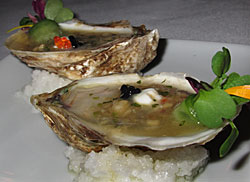 Huître décorée de crème fouettée, touche de caviar de truite et de mulet pour apporter le croquant et la couleur, micro pousses, sauce citronnée. Très fin.
