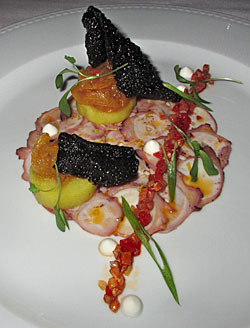 Une très belle assiette, un véritable petit tableau. Bien architecturé et délicieux. La délicatesse du poulpe tranché finement se mariait admirablement avec les piperades servies l’une chaude, l’autre froide. Les croustilles de riz à l’encre de seiche ponctuaient l’assiette de sa couleur noire sans effacer ses flaveurs prononcées.