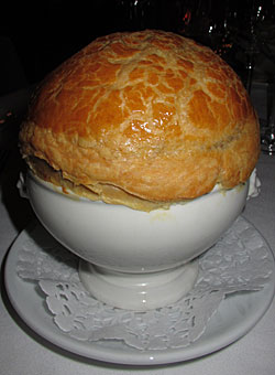 Un classique bien connu de ce chef illustre fêtant cette année ses 90 ans. Le consommé de volaille aux truffes noires et tranches de foie gras était emprisonné dans une croûte de pâte feuilletée cuite au four. C’est lorsqu’on casse la croûte, celle-ci tombe dans le liquide le transformant en soupe (pas de pain, pas de soupe). Beaucoup de finesse et de parfums subtils. À savourer lentement!