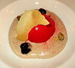 Bombe glacée aux griottes, sabayon au cabernet sauvignon, sablé aux pistaches Finesse, délicatesse et réussite. Le petit sablé très goûteux disparaissait sous la demi-sphère glacée recouverte d’un rouge brillant séduisant. Le sabayon crémeux soutenait en tendre douceur la glace à la griotte. Un équilibre parfait si l’on ne croque pas les cerises au marasquin trop agressantes. Un beau dessert!