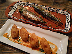 Nous avons débuté avec des croquettes de morue « Pasteis de bacalhau » (4 par assiette), des sardines grillées (2 bien dodues) servies sur de la vaisselle portugaise. Rien à dire, c’était délicieux. Ce début de repas, l’ambiance, les grils doubles pour cuire le poulet en crapaudine, le chorizo tranché devant nous, les viandes fumant sur le gril, la salade bien arrosée de vinaigrette vigoureusement brassée, le verre de vin blanc Vinho Verde bien frais, nous ont transporté sur les rives du Douro. Nous avons continué notre repas avec un grand plat « Combo poulet, porc et agneau bifana», un spécial proposé par un des responsables pour conclure nos hésitations.