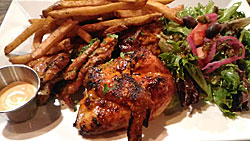 Il faut vraiment un solide appétit pour vaincre le contenu de ce plat, même à deux. Il débordait de viandes grillées, de frites et de salade, accompagnées d’une sauce rosée. Là, j’aurais préféré une sauce plus typiquement rurale goûtant la tomate, l’ail, les fines herbes, et un peu plus relevée. Mais nous sommes au Québec et il faut contenter la clientèle. De toute façon, nous nous sommes régalés, nous avons tout mangé.