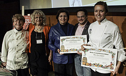 Photo ci-dessus à gauche: Soeur Angèle, Huguette Béraud, vice-présidente-directrice générale des Éditions Debeur, Fatima Houda-Pepin, députée de La Pinière de 1994 à 2014, Frédéric Laplante, chef cuisinier national de l'année SCCPQ et Marie-Ève Langlois, apprentie cuisinière nationale de l'année SCCPQ