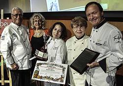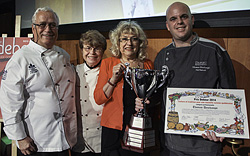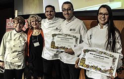 Photo ci-dessus à droite: Denis Paquin, directeur de la région de Montréal de la Société des chefs, cuisiniers et pâtissiers du Québec (SCCPQ), et directeur du Prix Debeur, culture et tradition pour une nouvelle cuisine québécoise, Huguette Béraud, vice-présidente-directrice générale des Éditions Debeur, Isabelle Fournier, récipiendaire du Prix Debeur 2014, catégorie étudiante, Soeur Angèle et François Matthey, chef enseignant en pâtisserie à l'école CFP Calixa-Lavallée